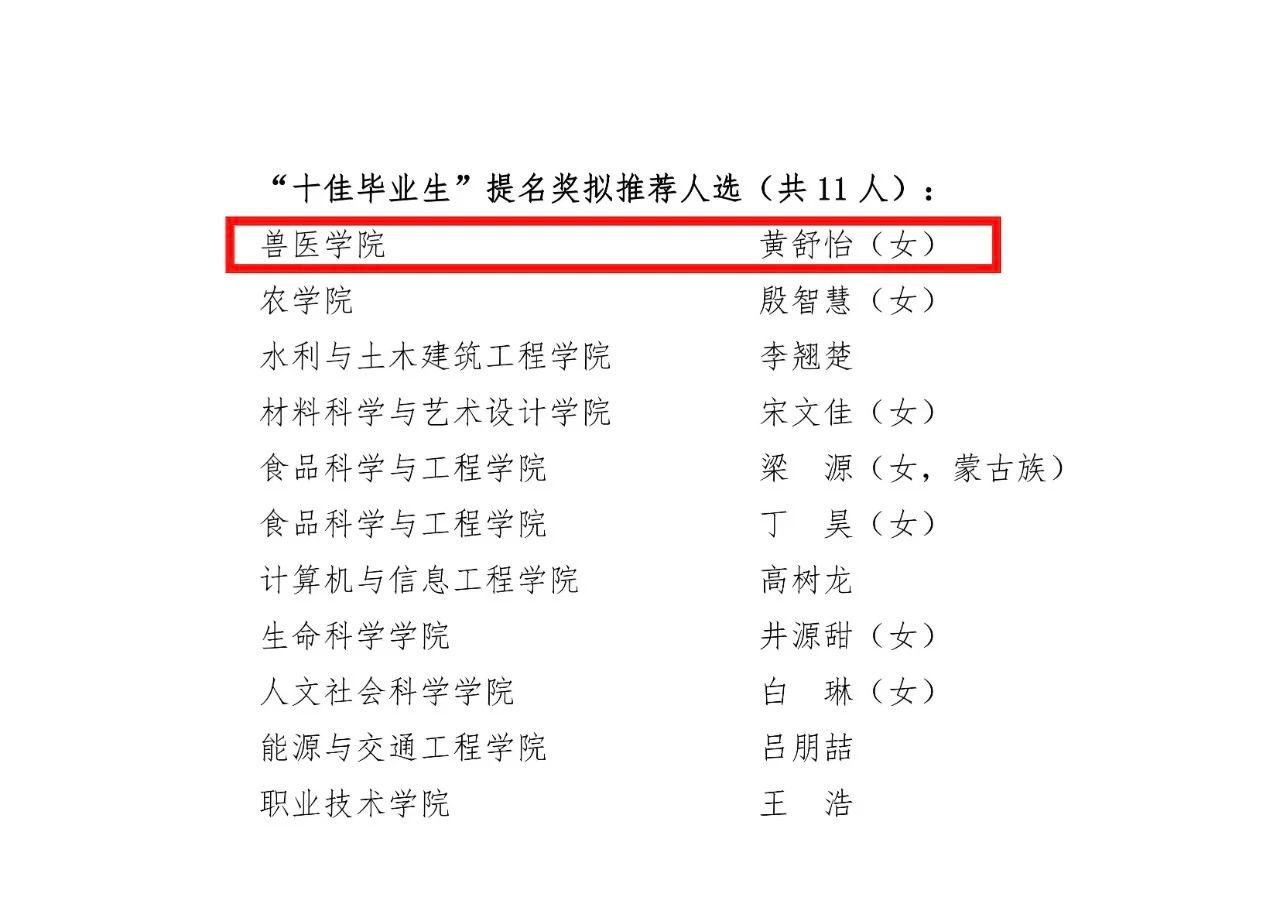 近日,公司第19届本专科“十佳毕业生”评选结果揭晓,公司19动医(英才)班黄舒怡同学荣获“十佳毕业生”提名奖。