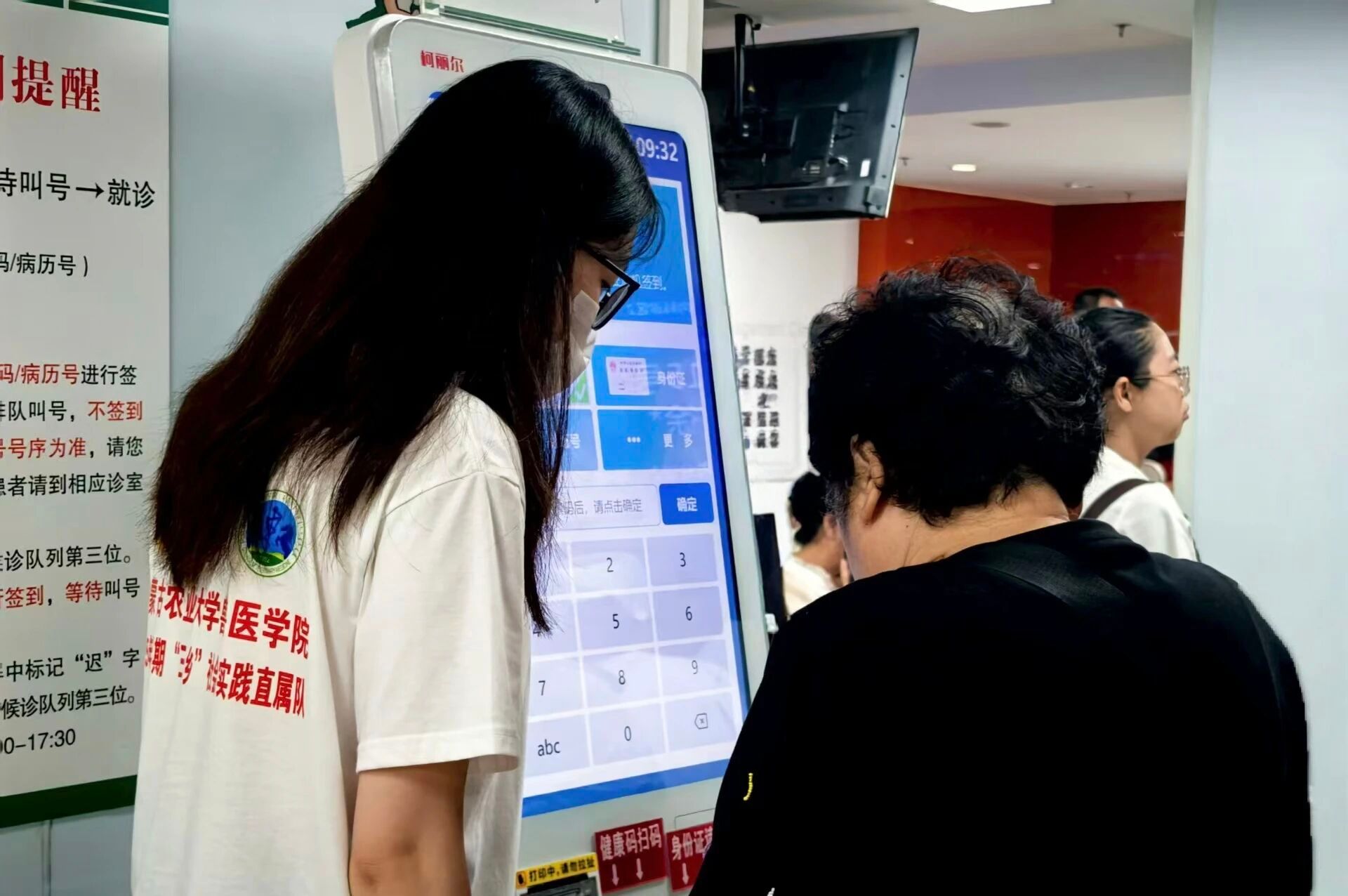 8月3日,直属队成员们再次到达内蒙古自治区人民医院,开展引导就医志愿活动,旨在体会“奉献、友爱、互助、进步”的志愿精神,提升队员们自身沟通能力、同理心等。活动内容包括引导患者及家属使用自助取票机、打印病历、指引就诊楼层方向等。队员们分工明确,每层分布一至两名志愿者,主动询问就诊患者的需求,保障服务质量。