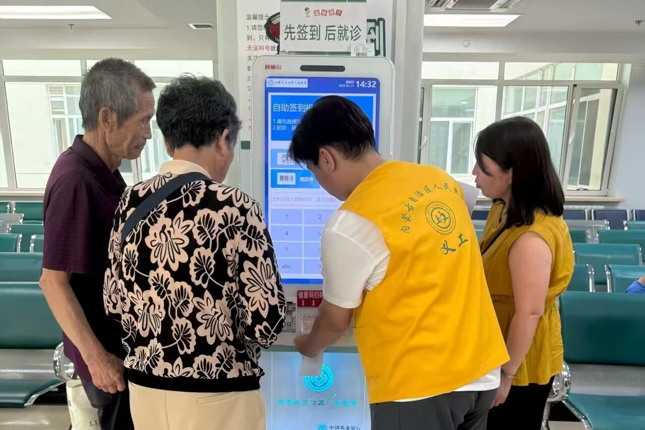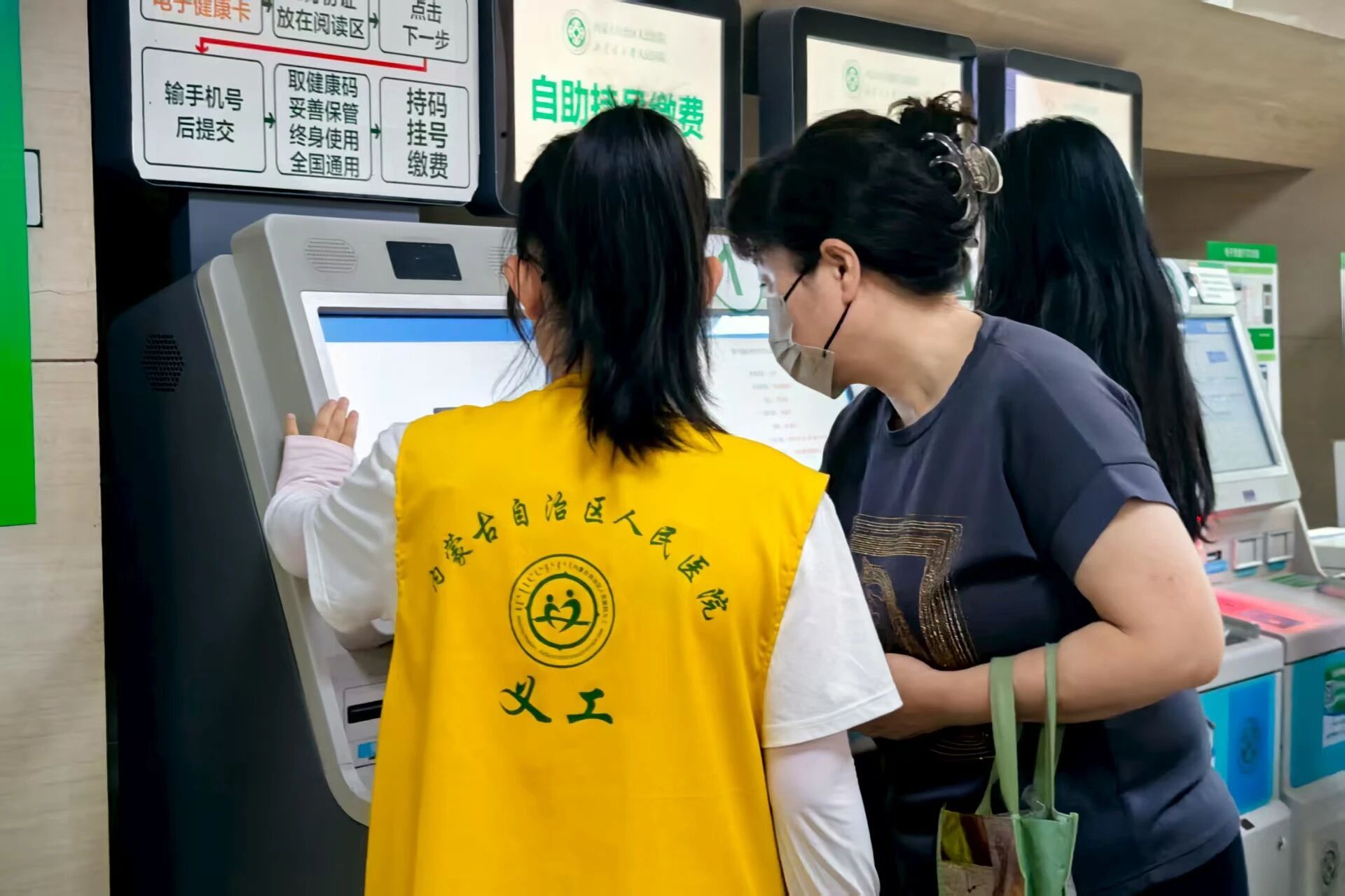 8月2日,呼和浩特直属队全体成员前往内蒙古自治区人民医院开展义工志愿服务。队员们身着黄色义工马甲,在医院各层倾听患者对机器使用流程的疑问并耐心解答,并在特殊情况时协助医护人员解决突发问题。