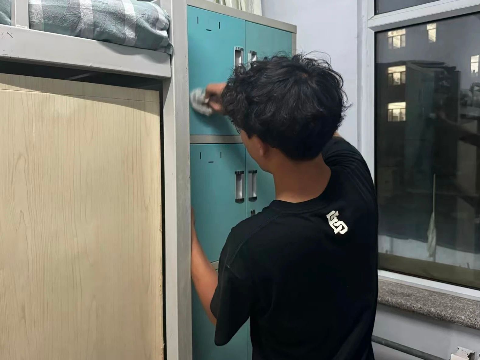 与此同时,员工会干部们则围绕军训内务整理的疑问展开重点解答与现场指导:他们拿起被褥示范“豆腐块”被子叠法,一边操作一边讲解折角对齐、线条压平的技巧;看到宿舍物品摆放杂乱时,主动分享生活用品定位摆放的小窍门,比如洗漱用品按类别排列、衣物分类收纳等,并耐心回应新生提出的内务细节问题,鼓励大家从日常整理中培养自律习惯。