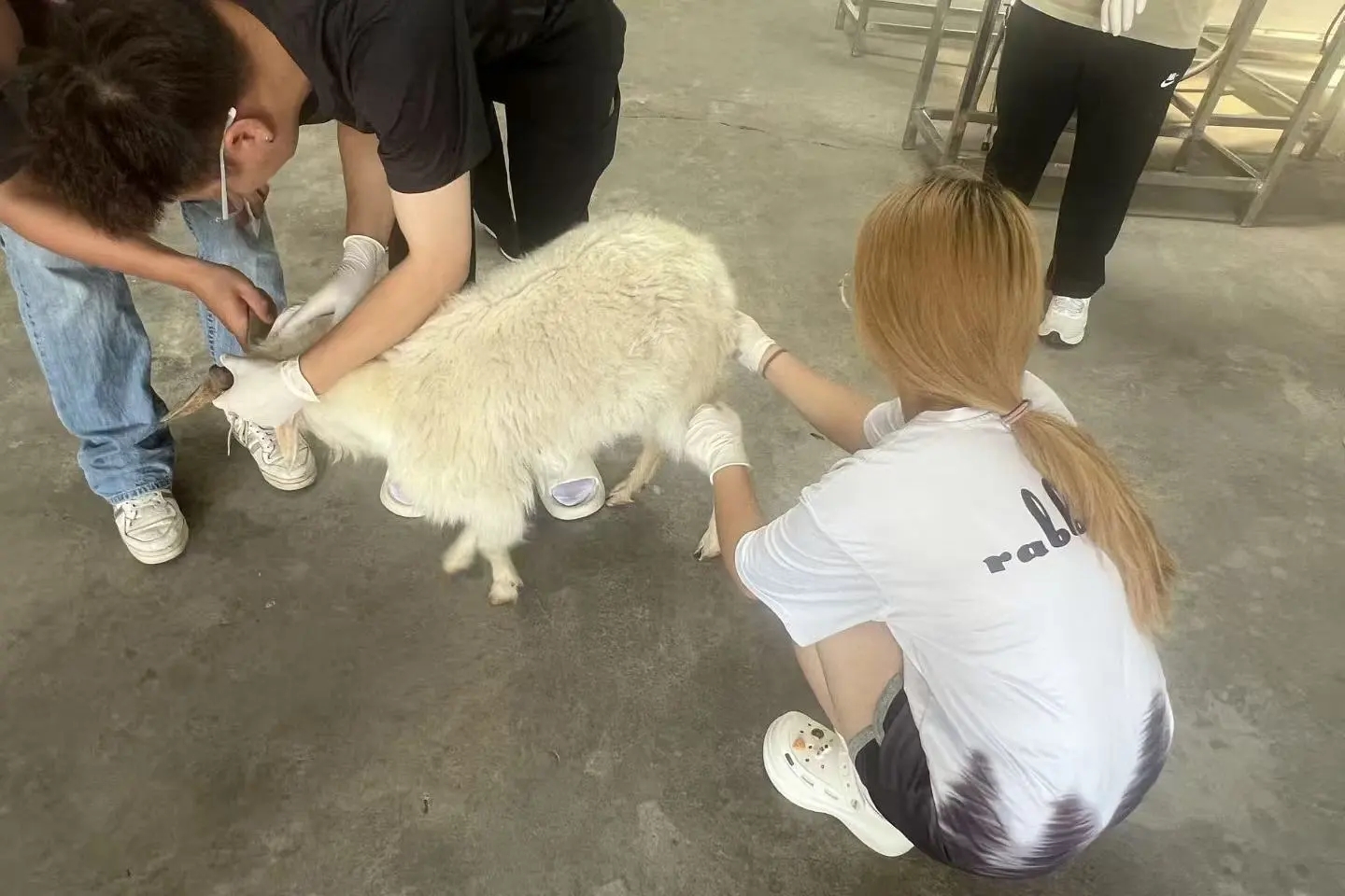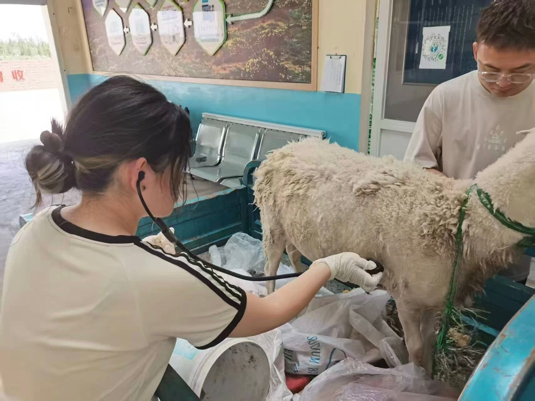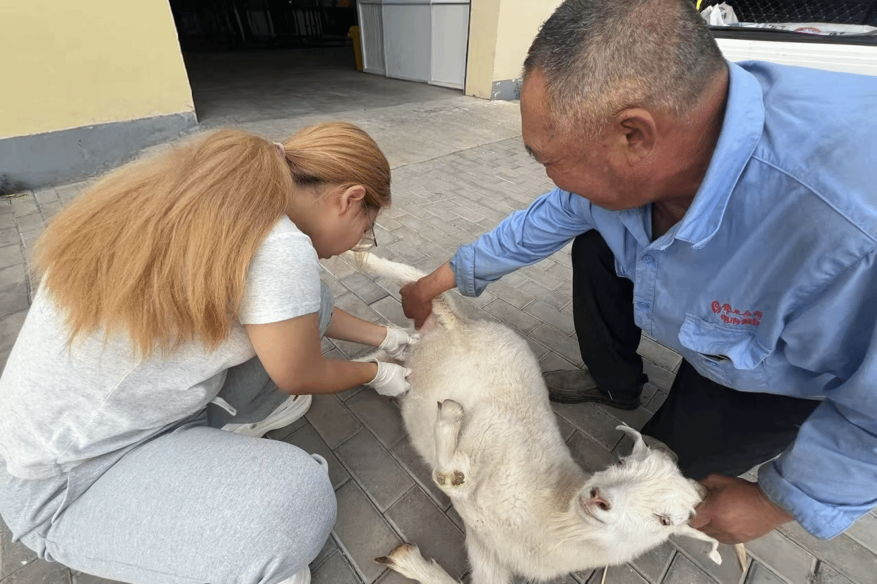 7月21日,第二批实习队员抵达科技小院,在与工作人员完成交接后随即投入工作。在检查羊圈时,队员们发现一只羊出现食欲不振的症状,随后立即对其进行了输液治疗。下午,队员返回牧康兽医院开展其他实践活动。7月22日,队员在巡检中发现一只羊羊角根部发软,经诊断确诊为脑包虫病,虫体压迫眼部神经导致失明,同时伴有40度高热,粪便检测显示感染仰口线虫;另有一只绵羊羔梭菌检测结果为阳性;三只小羊羔经听诊发现肺部存在沙沙声,确诊患有肺炎。针对上述不同病症,队员们制定了针对性治疗方案,并对住院病羊实施了剖腹产手术及输液治疗。7月23日,队员们继续忙碌。一只公羊因尿路结石无法自主排尿,队员为其进行尿结石手术;一只种羊精神萎靡、肺部有异响,在确诊为肺炎后为其注射多西环素和氟苯尼考;一只羊食欲不振,粪便检测发现线虫,采用灌药治疗;另有两只羊分别确诊为肺炎和脑包虫病,分别给予注射药物和灌药治疗。