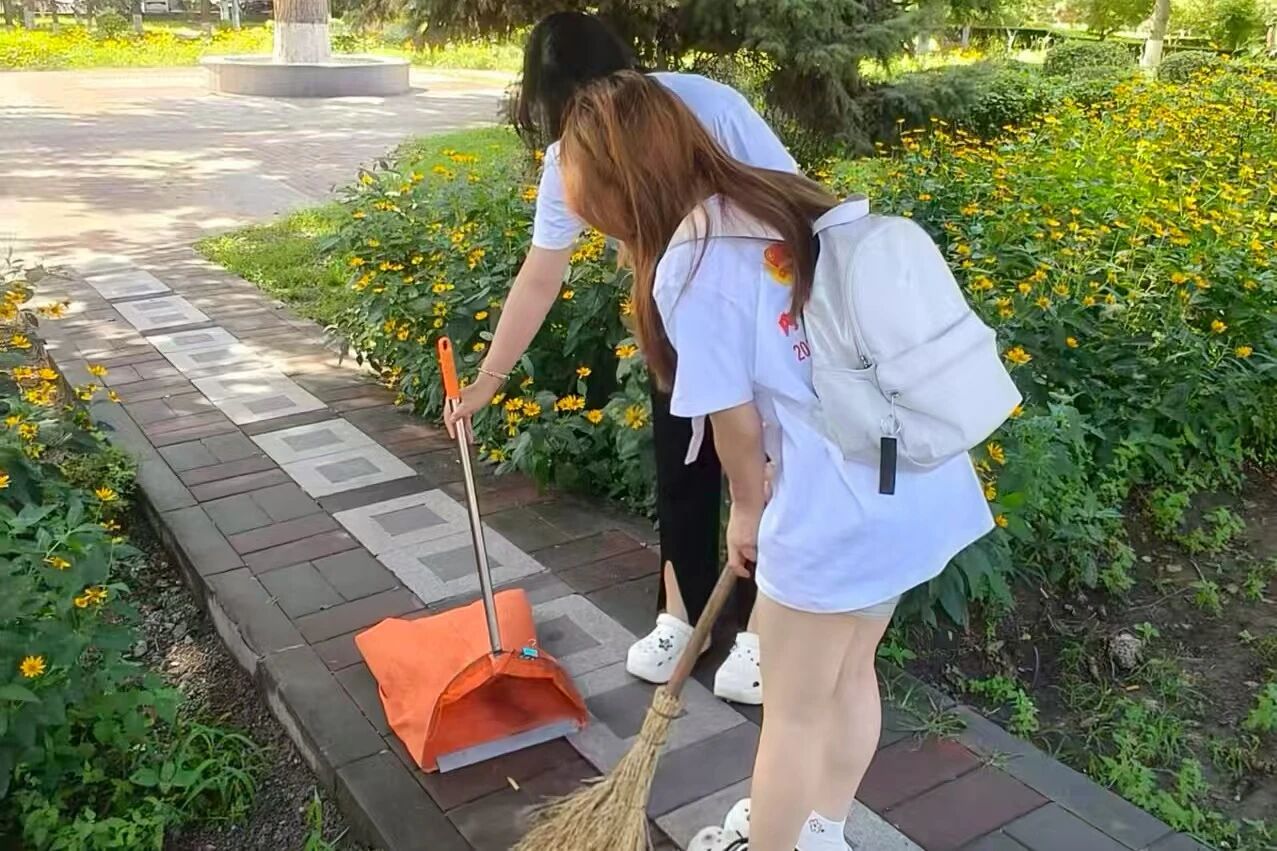 随后队员们主动加入志愿服务,见环卫工人顶着烈日清扫,大家拿起工具分片行动,细致清理花丛中的塑料瓶、石板缝里的烟蒂等。