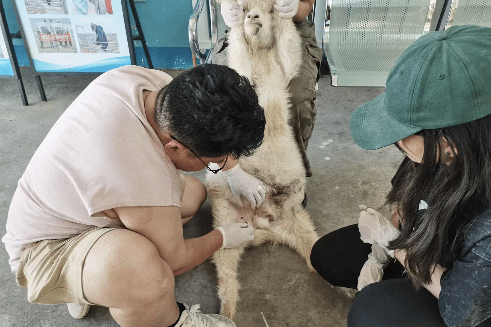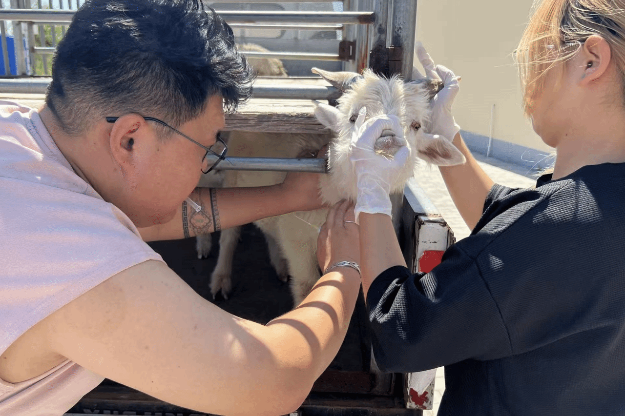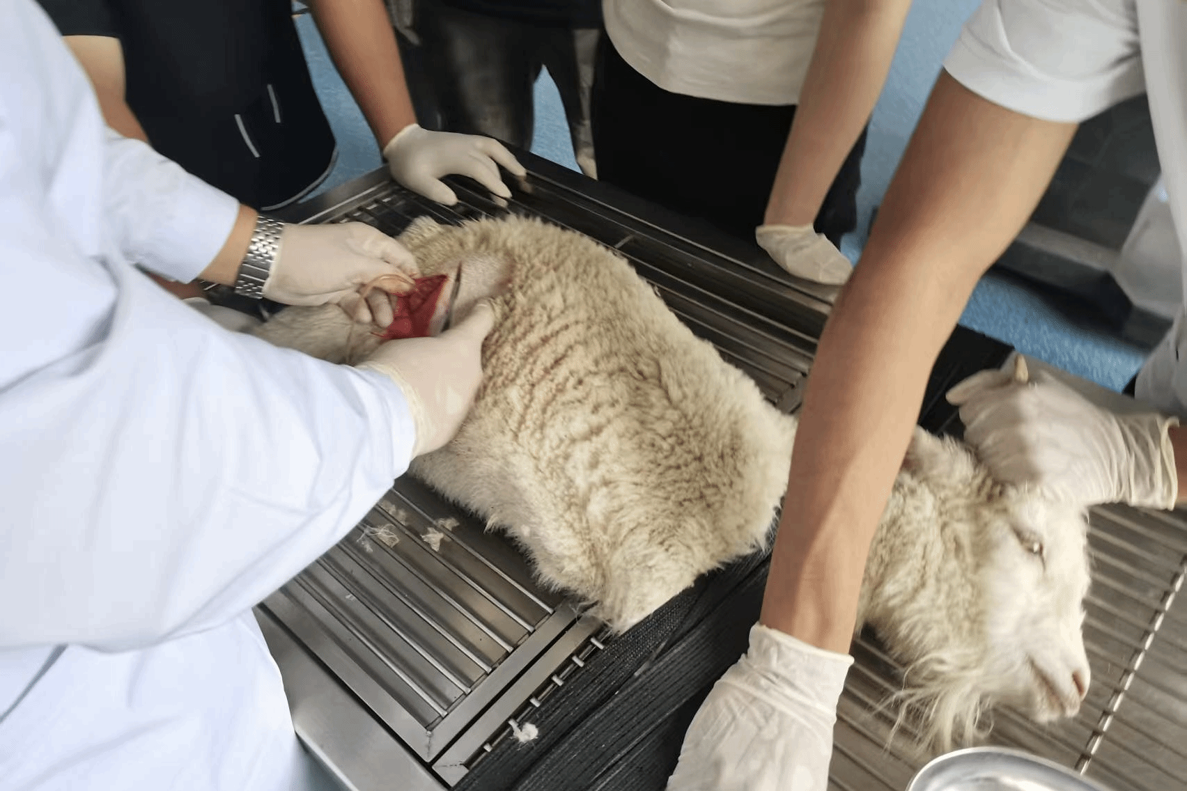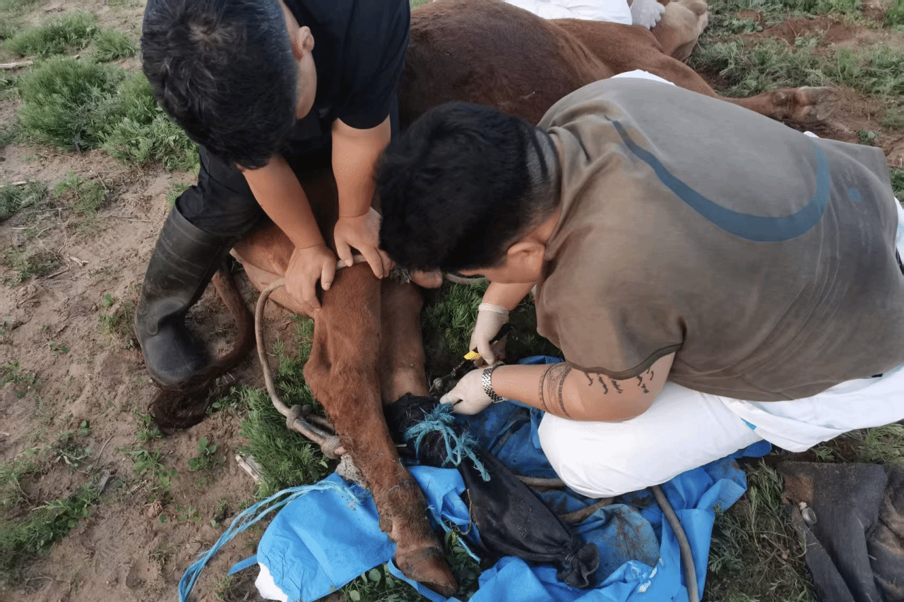 7月27日,队员们为被大羊顶伤导致小肠外露的小羊实施了缝合手术,同时对蹄部被利器划伤的牛进行了消毒包扎处理。7月28日,直属队成员对前一日接受手术的小羊进行体温监测,在发现其存在低烧症状后及时注射药物干预。随后,直属队解剖了一头死因不明的羊,并确诊其病因为肺炎。除此之外,在队员们的检查下也得出此前出现尿闭症状的山羊实为膀胱破裂导致。另有一只山羊检测出感染小反刍病毒,队员们立即按规程开展无害化处理与环境消毒;同时在为牛群接种疫苗过程中,发现一头牛因巴氏杆菌感染已死亡,直属队成员随即对同群牛进行紧急排查并强化防疫消毒。7月29日,队员们为术后排尿异常的羊实施了尿道改路手术,还对一头难产母羊进行助产,成功取出其腹中已夭折的羊羔。