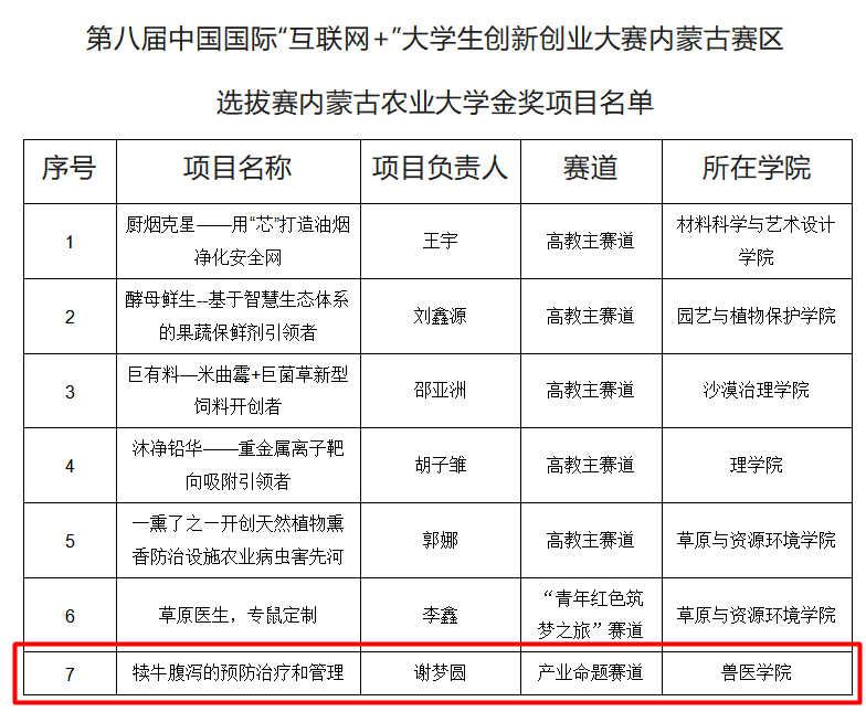 8月10日,由自治区教育厅主办,内蒙古师范大学承办的“建行杯”第八届中国国际“互联网+”老员工创新创业大赛内蒙古赛区选拔赛在全区各高校分赛场通过线上比赛的方式举行。经过激烈角逐,由公司徐晓静等教师指导,谢梦圆等同学完成的项目《犊牛腹泻的预防治疗和管理》在30支决赛队伍中脱颖而出,一举获得产业赛道金奖第一名,这也是公司在产业赛道获得的首个金奖。