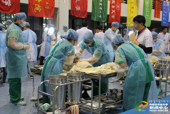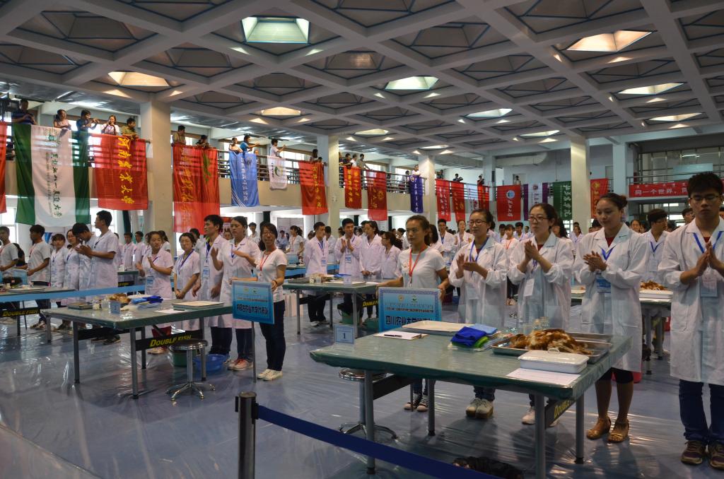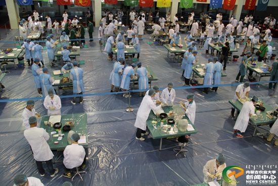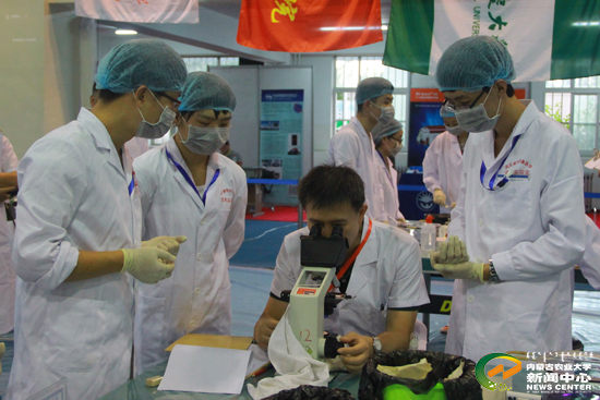 据了解,本次大赛共有来自全国43所院校的46名专家组成裁判团,全国具有动物医学本科培养的42所高等院校168位选手参赛,另外还有2所高校派出观摩代表队。在1名带队老师、1名专业指导教师和4名动物医学专业本科员工组成的各校代表队,经过了15日全天和16日上午进行的外科手术项目(绵羊瘤胃切开术手术)、病理剖检项目(鸡的病理剖检类)、病原菌检查项目共3轮比赛。比赛中用到的道具都是活物,病原菌的检查用到小白鼠,病理解剖用到的是检巴氏杆菌病死鸡1只,外科手术中用到的则是45~50kg/只的绵羊。各代表队选手们都以饱满的热情、充分的自信、严谨的态度、默契的配合投入竞赛,比拼专业素质及操作能力。