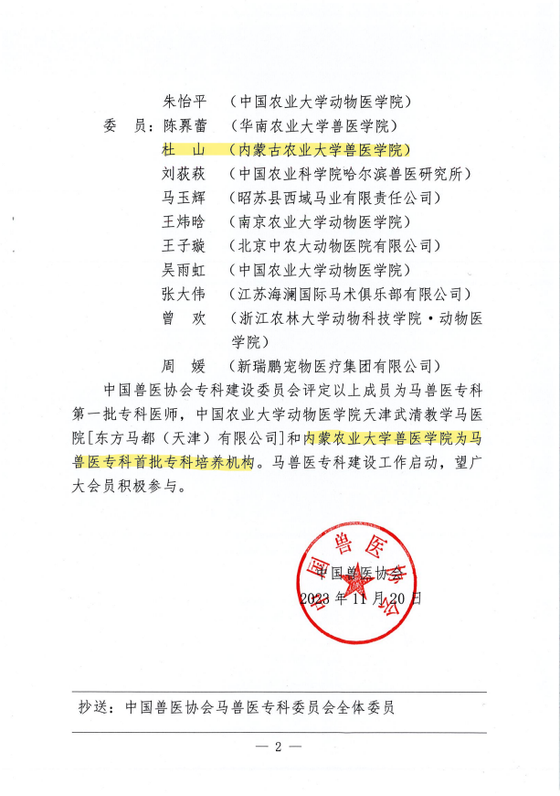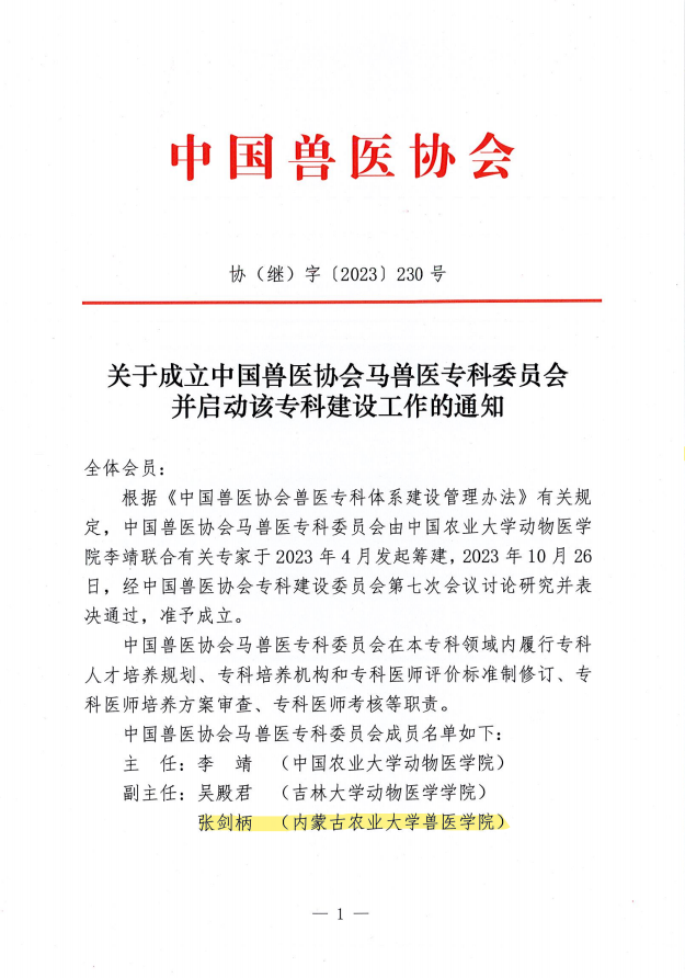近日,中国兽医协会马兽医专科委员会正式成立。公司被中国兽医协会专科建设委员会评定为马兽医专科全国首批专科培养机构。公司张剑柄、杜山两位老师分别担任中国兽医协会马兽医专科委员会副主任、委员职务,并成为马兽医专科第一批专科医师。