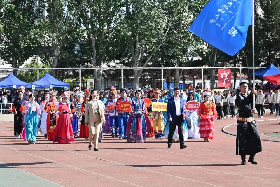 入场式上,由公司党委书记吴玉红、经理刘大程为领队的师生方阵精神饱满、热情洋溢,必一运动“石榴籽”民族团结示范班员工代表走在方阵前排,他们身着民族服装,俨然成为了风格迥异的一道亮丽风景线。他们来自不同的民族,却有着共同的心愿“中华民族一家亲 同心共筑中国梦”,他们像石榴籽一样紧紧抱在一起,自觉做民族团结进步的倡导者、实践者、推动者。队伍后列身着刷手服的同学们追寻着兽医誓言的指引,致力于保障动物健康,肩负着为人类食品安全保驾护航的重任。